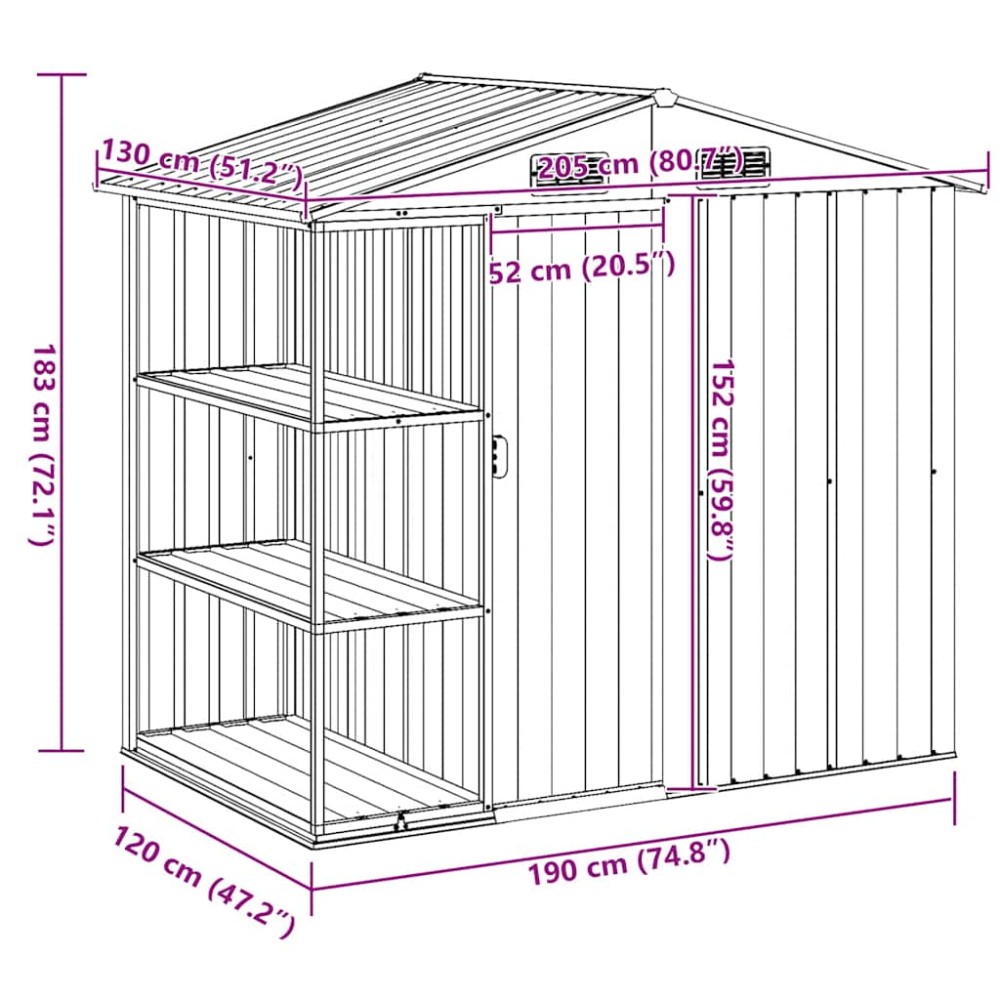 - Άφθονος χώρος αποθήκευσης: Το εξωτερικό υπόστεγο αποθήκευσης είναι ιδανικό για τη φύλαξη διαφόρων εργαλείων κήπου, εξοπλισμού φροντίδας γκαζόν, ειδών οικιακής χρήσης και άλλων αξεσουάρ κήπου.