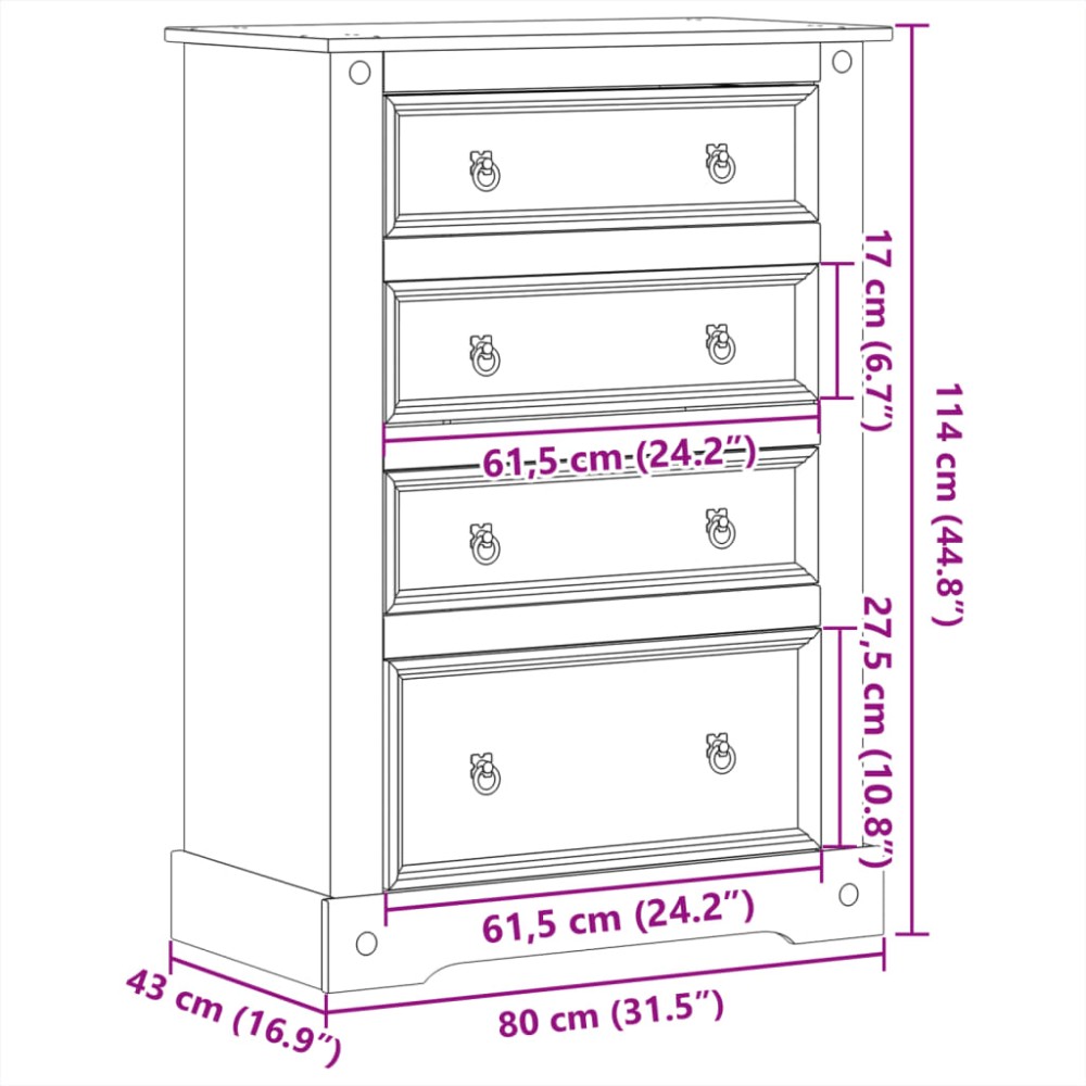 - Μασίφ ξύλο πεύκου: Το μασίφ ξύλο πεύκου είναι ένα όμορφο φυσικό υλικό. Το ξύλο πεύκου έχει ίσια νερά και οι ρόζοι χαρίζουν στο υλικό τη χαρακτηριστική, ρουστίκ όψη του. Κατασκευασμένη από μασίφ ξύλο πεύκου, η συρταριέρα είναι ανθεκτική και στιβαρή.