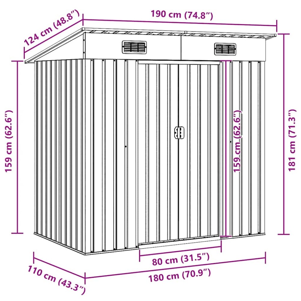 Αυτό το υπόστεγο αποθήκευσης διαθέτει 2 αεραγωγούς στο μπροστινό μέρος, εξασφαλίζοντας άριστο αερισμό. Οι διπλές συρόμενες πόρτες στο μπροστινό μέρος επιτρέπουν την εύκολη είσοδο και έξοδο. Η κατασκευή από γαλβανισμένο χάλυβα, μαζί με το φινίρισμα με επικάλυψη ψευδαργύρου, το καθιστούν ανθεκτικό και στιβαρό, ώστε να μην διαβρώνεται ή να επηρεάζεται από ακραίες καιρικές συνθήκες.