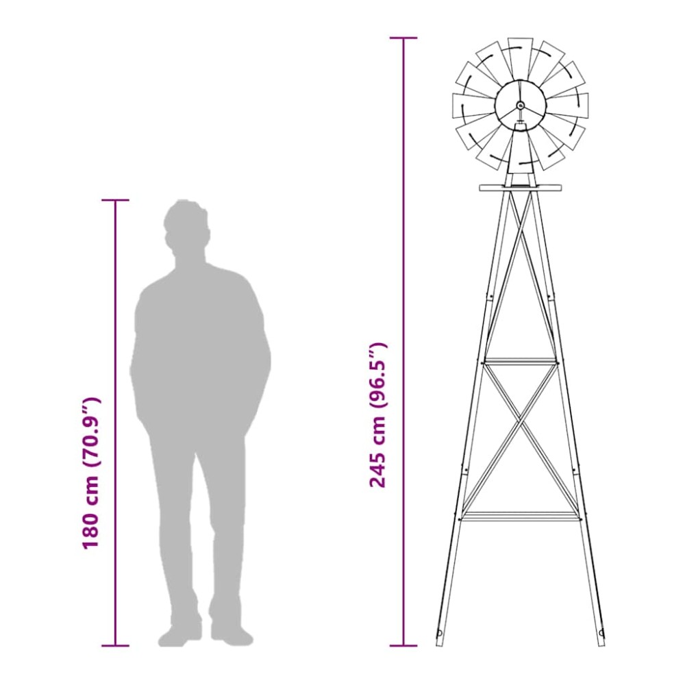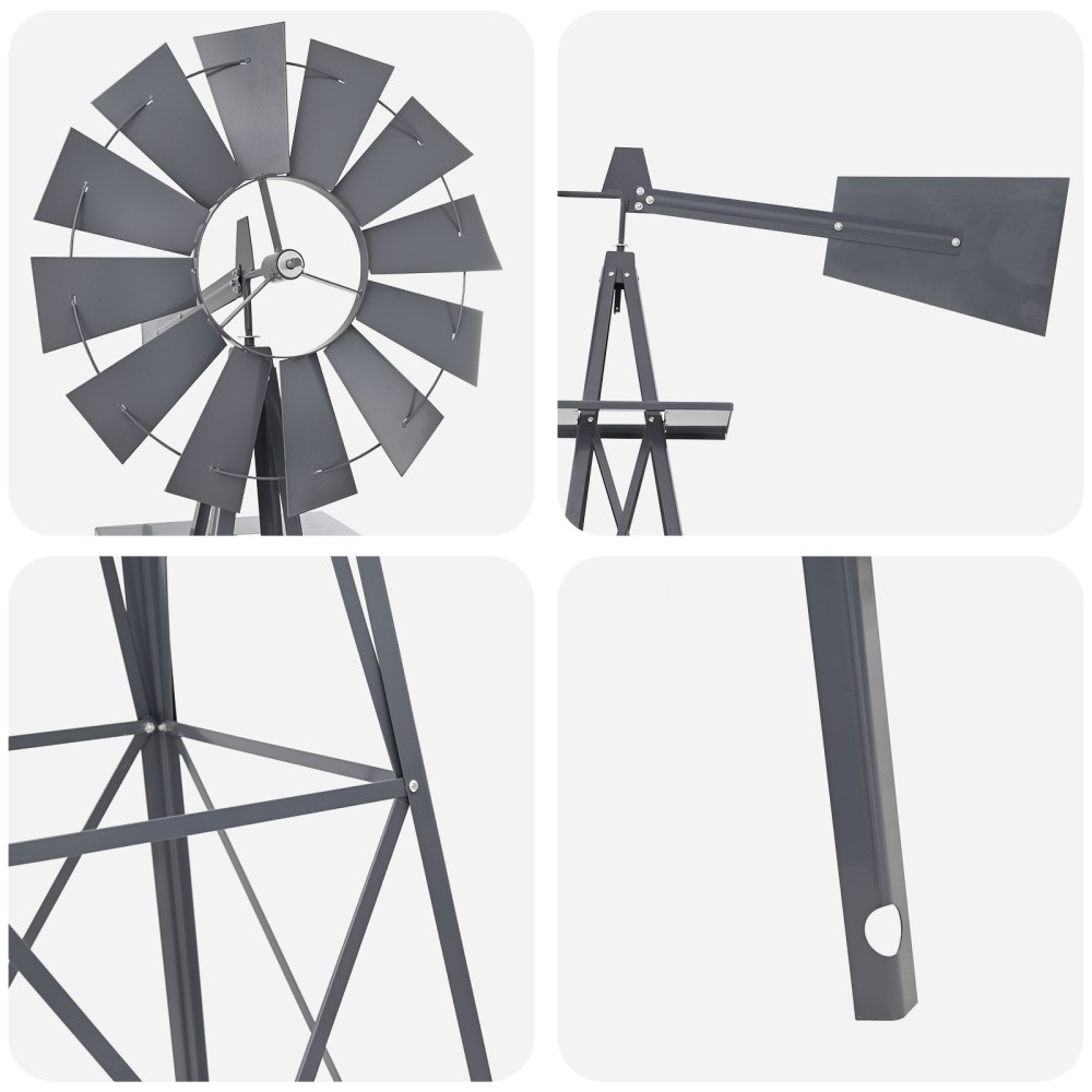 • Σύνθεση Υλικών: Φτιαγμένος ολόκληρος από σίδερο, αυτός ο ανεμόμυλος έχει εξαιρετική αντοχή. Η λεία επιφάνεια του είναι όμορφη και σχεδιασμένος για να αντέχει στη φθορά και τις καιρικές συνθήκες. Ο βιομηχανικός σχεδιασμός του τον καθιστά ιδανικό για τους κήπους.